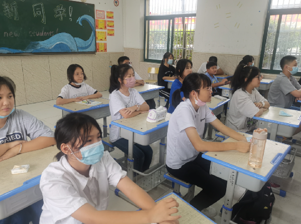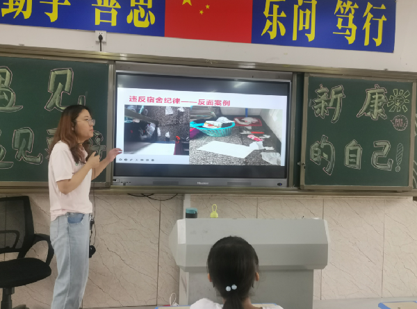 学生的宿舍内务处理好之后,便进入班级开始27日和28日两天的入学教育。27日的入学教育包括“了解新康——做自豪的新康人”,“六不六静——校园文明礼仪”,“集合、解散、离场——队列队形训练”,另外还进行了宿舍叠被子训练和校园文明礼仪教育。28日进行了早读训练,对学生的坐姿和声音提出了要求,进行了眼保健操教学,进行了中学生守则学习和校园安全教育等。