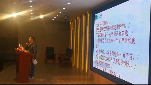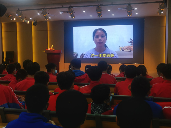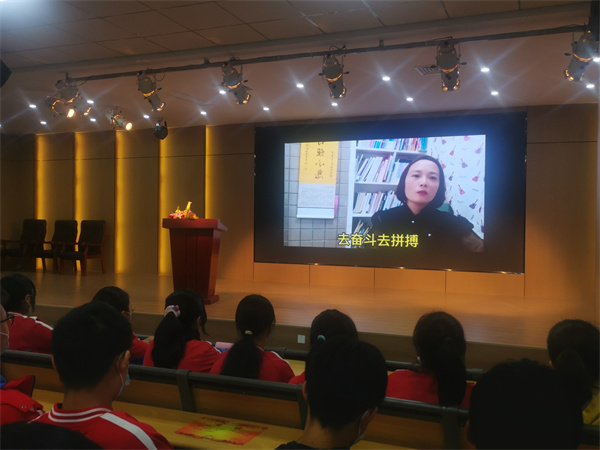 然后播放各班家长代表录制的鼓励视频,视频中家长们用亲切的口吻对考生们由衷的鼓励,用坚定的口吻告诉考生们他们是最温暖的后盾,用激昂的口吻对考生们表示要全力以赴不负众望。一声声关怀、一句句祝愿、无不凝聚着父母的期望。学生们用热烈的掌声送给默默守护的家长、送给无悔奉献的老师、送给精心培养的学校。
