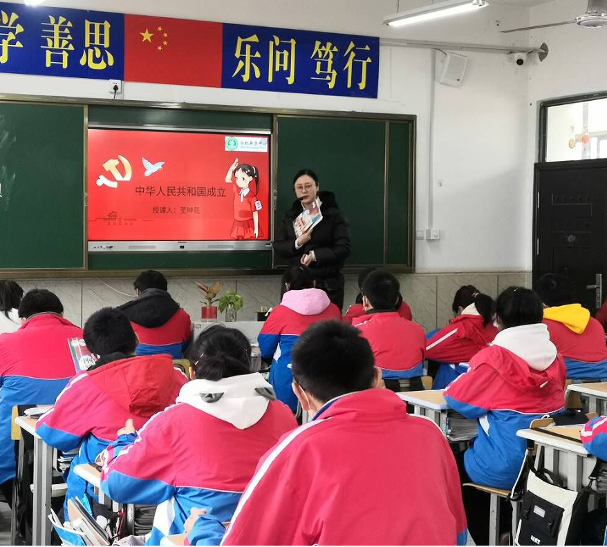 为了促进青少年全面健康成长,引导学生努力成长为担当民族复兴大任的时代新人,2023年2月14日上午,历史组圣坤花老师在八年级(3)班展示了一堂题为《中华人民共和国成立》的思政公开课,校领导及全体政史组老师参加了本次思政公开课教研活动。