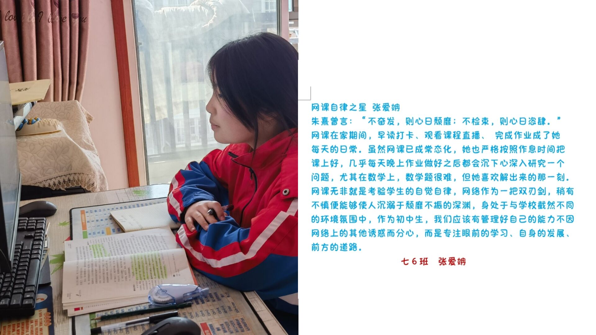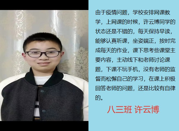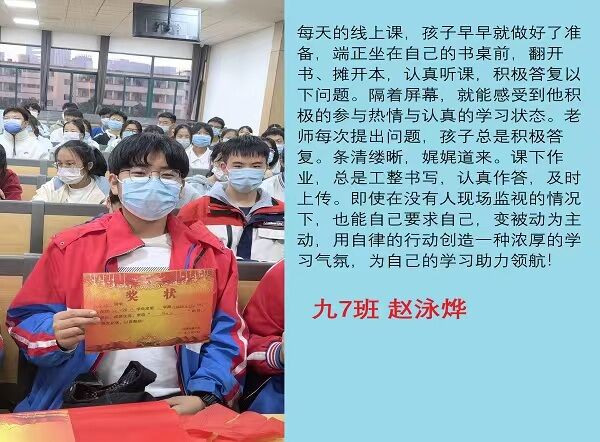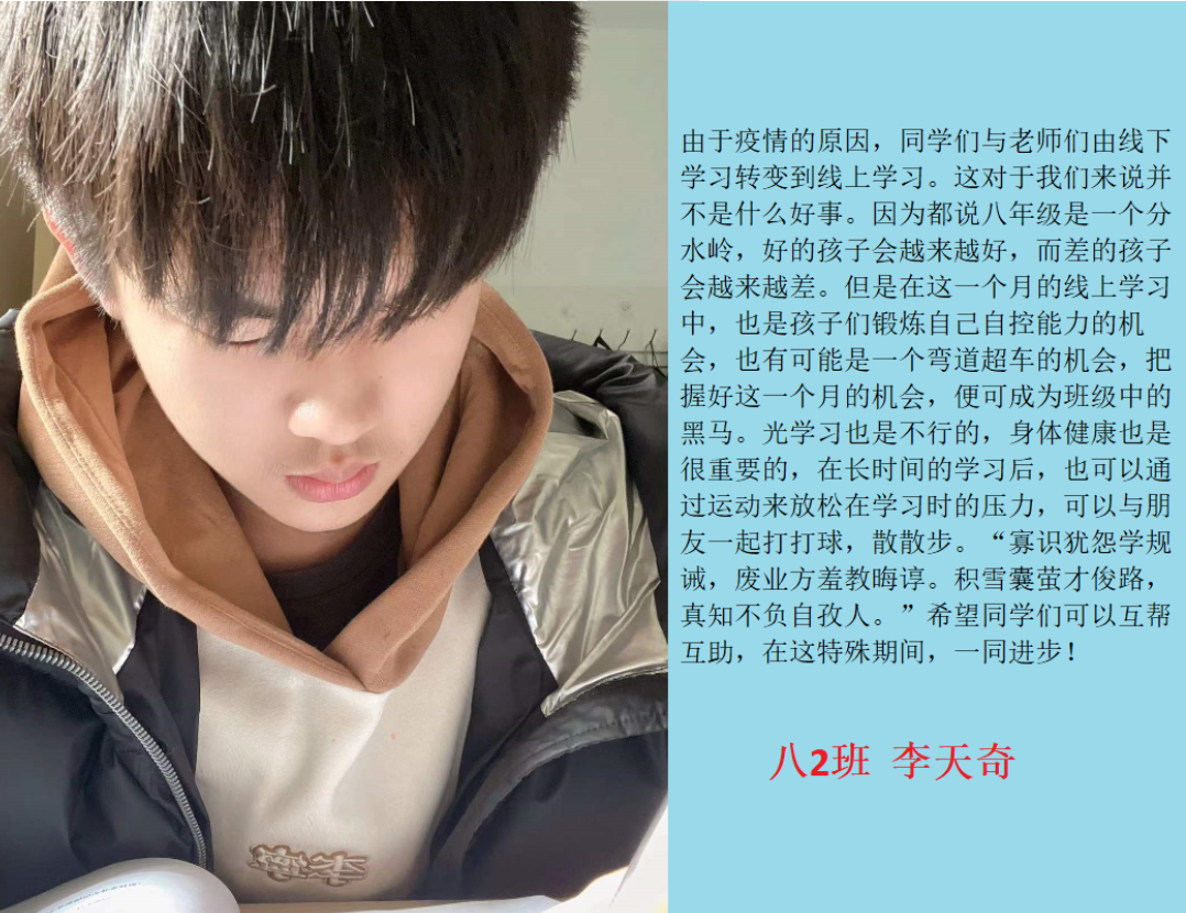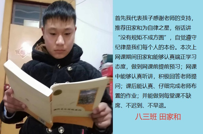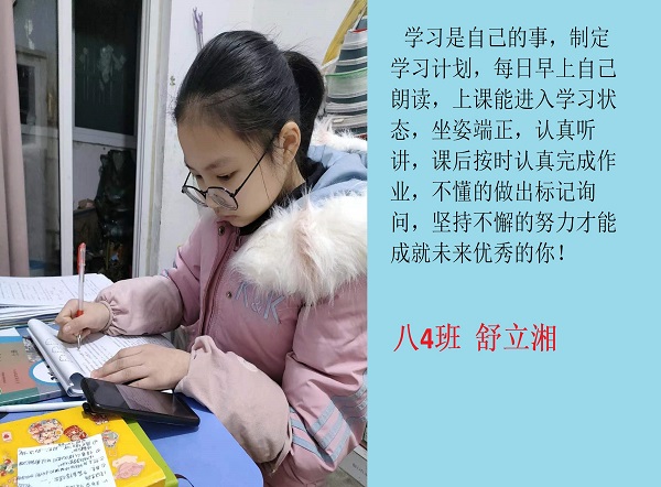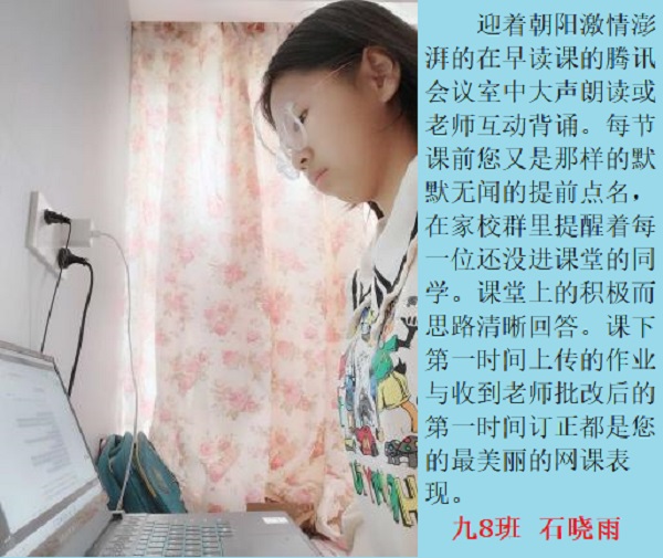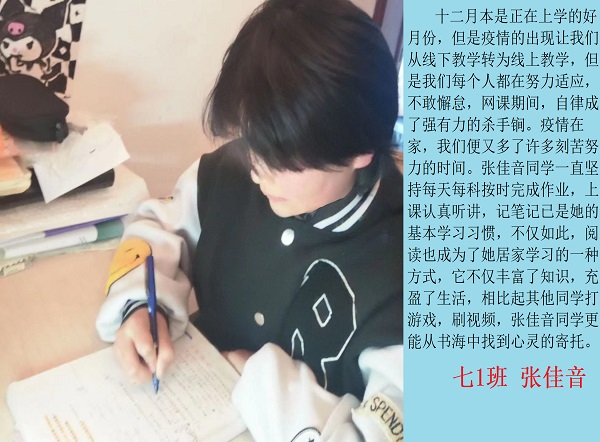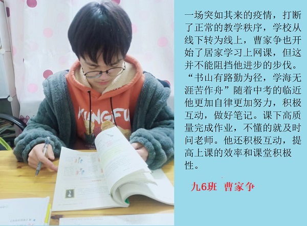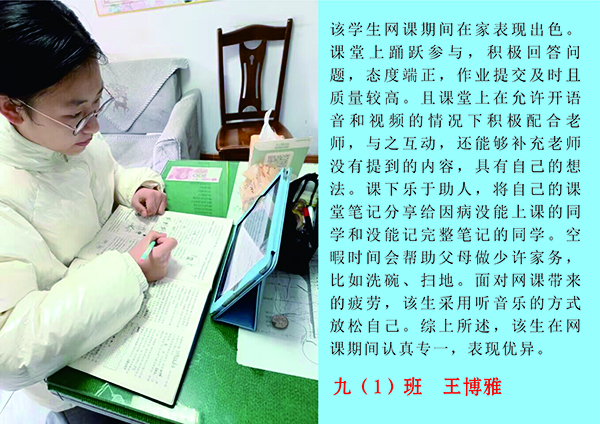 线上奋进少年时,莫向光阴惰寸功。疫情期间线上学习的时光里,学校涌现出一批自律自强的学生,他们认真听讲,积极思考,在知识的国度里孜孜不倦,真正做到学习地点改变了,但学习热情不减,为宅家学习添上了一抹绚丽的色彩。