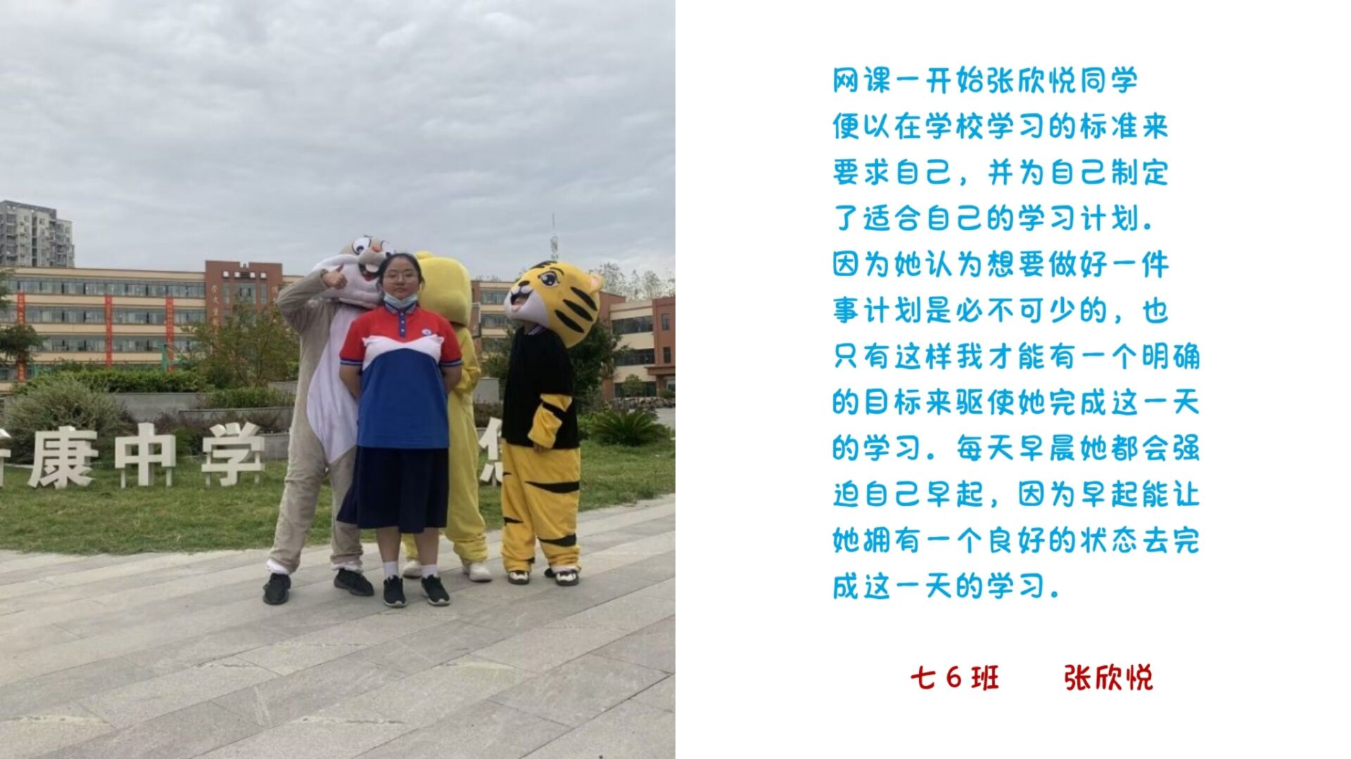 他们正身俟时,守己律物,不仅在电脑的另一端发奋学习知识,认真完成老师布置的任务,在知识的海洋中航行不辍,更能用实际行动践行“诚正”之德,自觉制订学习计划,主动为同学答疑解惑,在行为处事中律己宽人,在完成任务时全力以赴,充分展现了新康学子的“诚正”品德与“精远”志向。