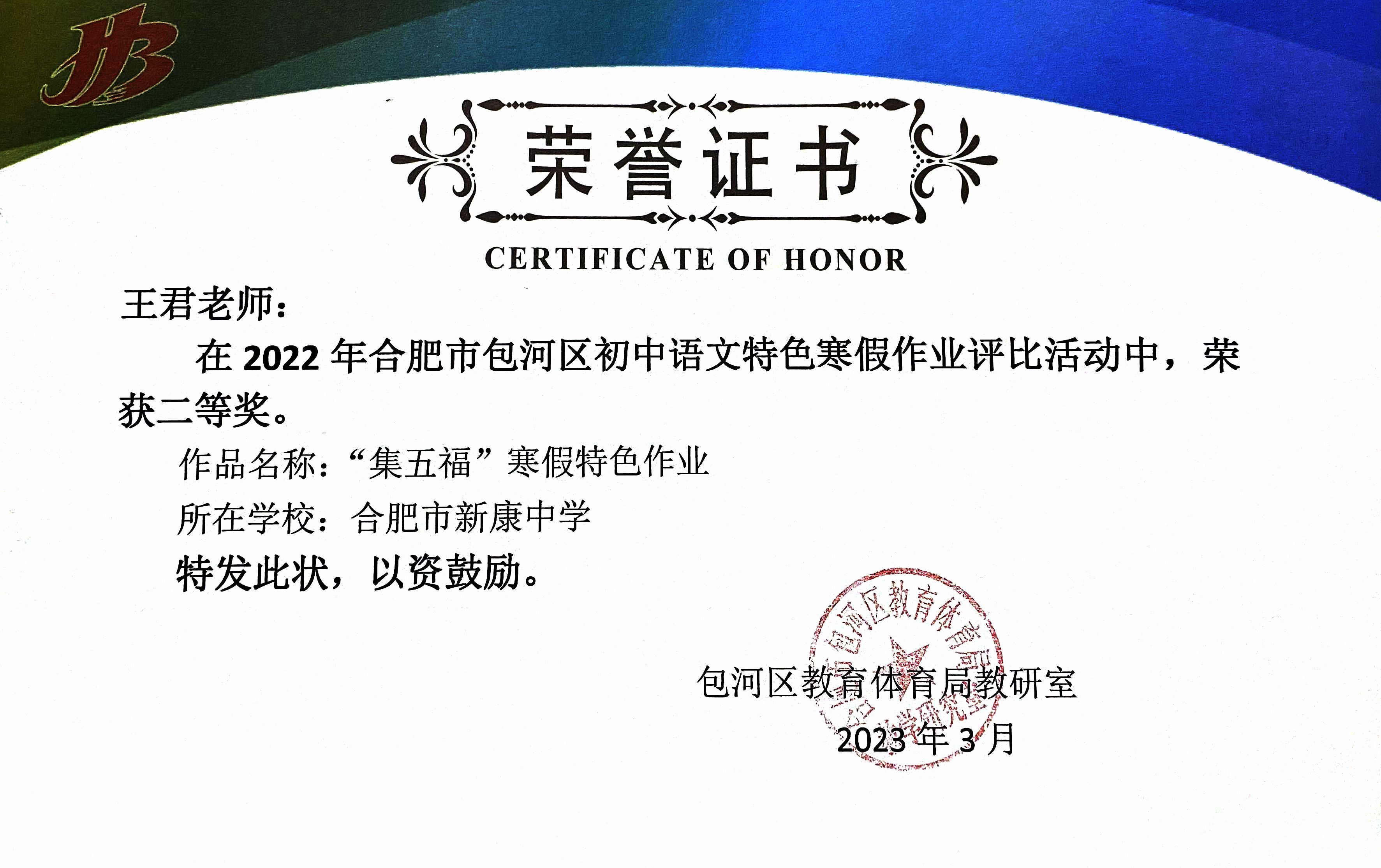 在2022年合肥市包河区初中语文特色寒假作业评比中,我校王君老师的“集五福”特色作业,荣获了二等奖。