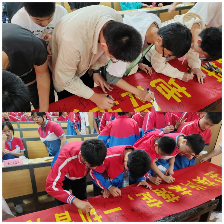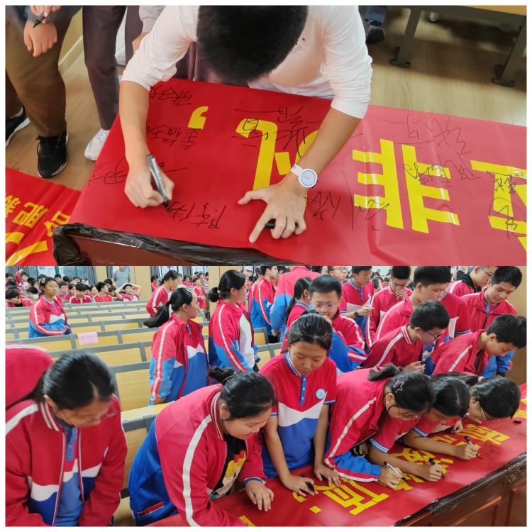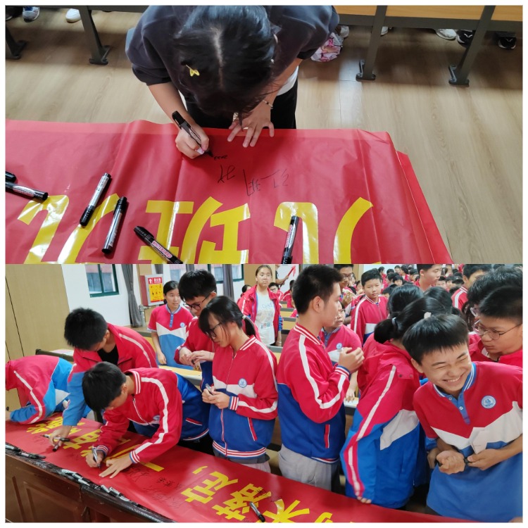 在九(2)班谷志远同学的带领下,毕业班全体师生进行了中考宣誓。毕业班学子斗志昂扬,誓言由心而出,浑厚有力,气势如虹,声达云霄,震颤在场每个人的心灵。随后,全体毕业班师生在自己的班级励志红幅上签名,并以举幅合照的形式记录此刻,让誓言长留心中。