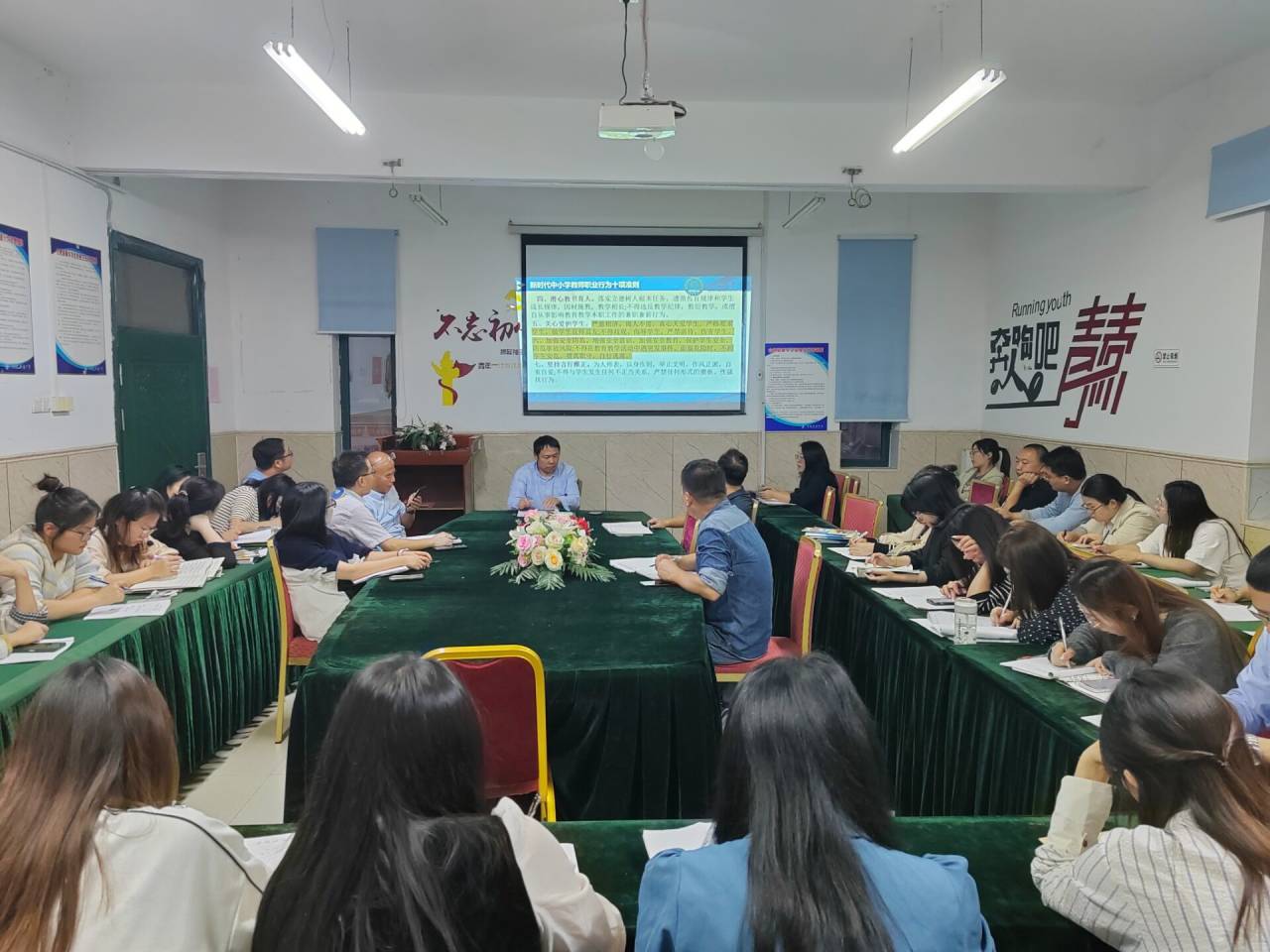 办公室王林副主任再次带领全体教师学习了《中小学教师职业道德规范》和《新时代中小学教师职业行为十项准则》,这两项内容的学习进一步增强了我校教师在教育上责任感、使命感和荣誉感,并从坚持党的教育方针的大局角度,引导了全体教师规范职业行为,明确师德底线,努力成为有理想信念、有道德情操、有扎实学识的仁爱之师。王主任随后播放了近年来各地发生的违反师德师风行为的视频案例,一个个真实的案例让与会的教师产生了强烈的震撼,起到了很好的警示作用。