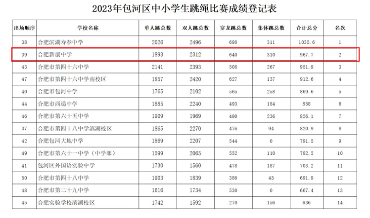 在中学组比赛中,我校以总分967.7分的优异成绩获得“团体总分第二名”,荣获“包河区中小学生跳绳比赛一等奖"。