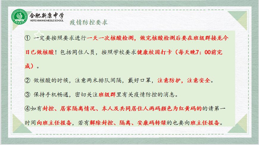1.普通文理科、体育类、少年班报名工作推迟。除艺术类以外的其他科类(含外地市考生委托报名)高考报名工作推后进行,具体报名时间另行通知,请所有考生(含往届)关注群消息,静候班主任通知,若有2022届毕业生返回我校报名请及时与原班主任联系,也请持续关注合肥招生考试网(http://www.hfzk.net.cn/)获取后续信息。感谢家长朋友们的支持和配合。