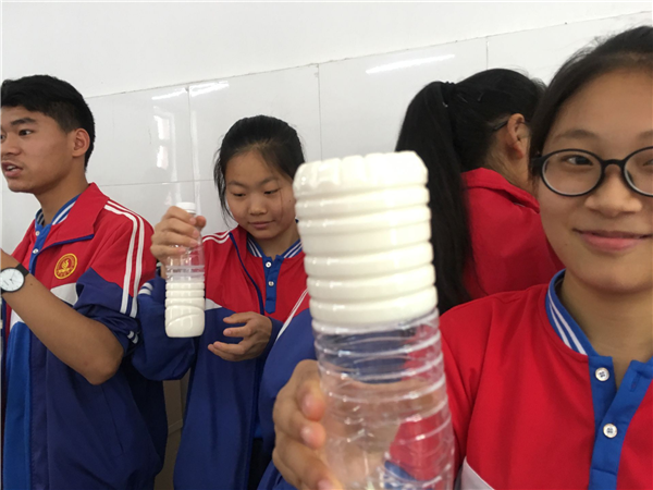 活动安排在大课间举行,学生们把准备好的纯牛奶倒入瓶中,加入适量的乳酸菌,搅拌均匀,然后经过24小时的发酵就成了酸奶。学生们看到液态的纯牛奶经过乳酸菌一昼夜的发酵成了粘稠的酸奶,十分惊喜。最让人高兴的是品尝环节。同学们拿着自己制作的酸奶,看着和果冻一样的质地,才知道小小的乳酸菌如此神奇,一天的时间就让牛奶变成了也如此粘稠的酸奶。闻一闻,有浓浓的酸奶味;尝一口,味道酸酸的。还有的学生不敢喝自己制作的酸奶,看到别人都喝,也勇敢地尝试着喝一口。品尝了正宗的酸奶的味道,学生们才知道原来超市中的酸奶是加了增稠剂和大量的糖。为了养成健康的生活方式,同学们表示以后还是自己制作酸奶比较放心。