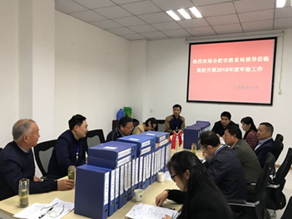 2019年4月30日上午,合肥市教育局党委委员、副局长陆昌云等领导一行6人来学校进行2018年度年检工作。合肥新康中学督导专员(第一书记)刘建国,董事长兼校长王俊、高中部校长耿业斌等全程陪同。