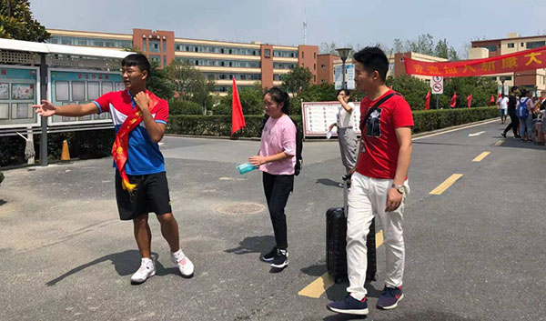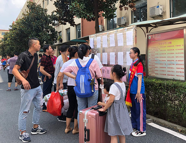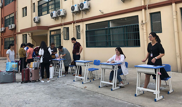 教师一早就为刚到的学生及家长进行报道的咨询解答。