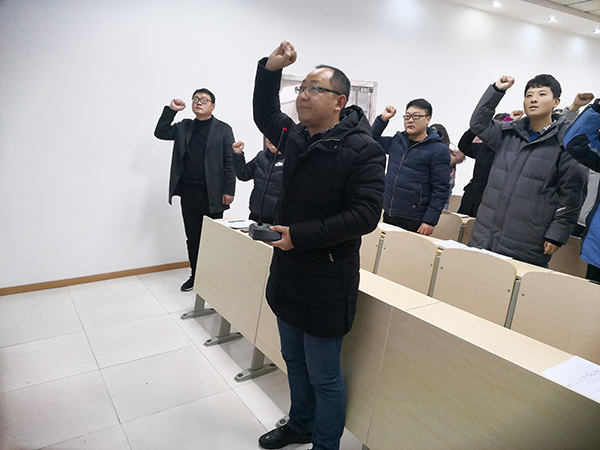 之后,由高一(1)班班主任刘强强老师带领全体班主任宣誓:把整个心灵献给孩子,用人格引领人格;以民主、平等的态度对待每一位孩子;呵护生命,尊重人性,激发创造;发展德智体,弘扬真善美;做学生爱戴的老班和真诚的朋友。期末大战在即,我会用我的耐心、爱心和真心鼓舞孩子用心复习,考出水平,考出好成绩。宣誓过程中,各位班主任斗志昂扬、语气坚定,用有声的誓言发出对期末的宣战。