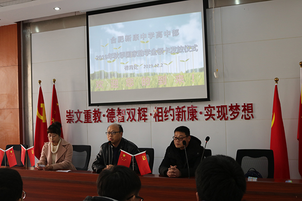 合肥新康中学高中部2019年秋季国家助学金发卡仪式于12月2日举行,市教育局学生资助中心孙主任、市教育局学生资助中心王主任、梅老师参会,此次会议在团委副书记、校资助负责人魏鑫老师的主持下圆满结束。
