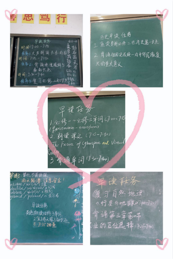 语文,英语和文综老师在前一天,告知科代表早读的各项任务,并在前一天晚自习下课后清楚地写到黑板上。每项任务都要限定时间,老师督促检查。有目标就不会迷茫,有压力就会有动力。明确目标,学生上课才有的放矢,限时完成,我们才会有紧迫感,才有高效率。
