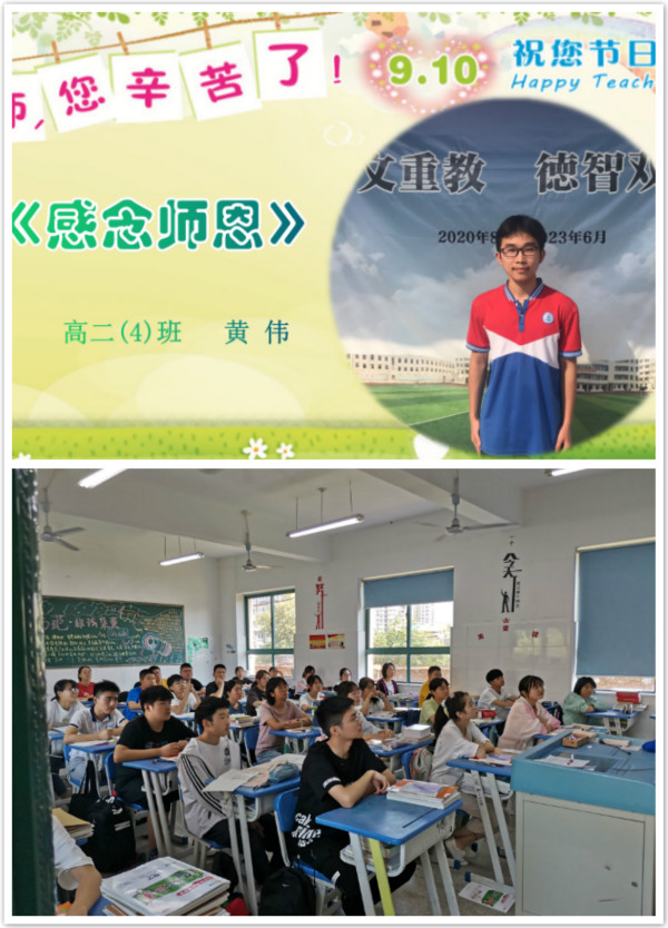 活动第三项:高二(4)班黄伟同学发言,主题为“感念师恩”。黄伟同学表达了自己对老师最崇高的敬意,感谢老师的栽培与教育之恩。