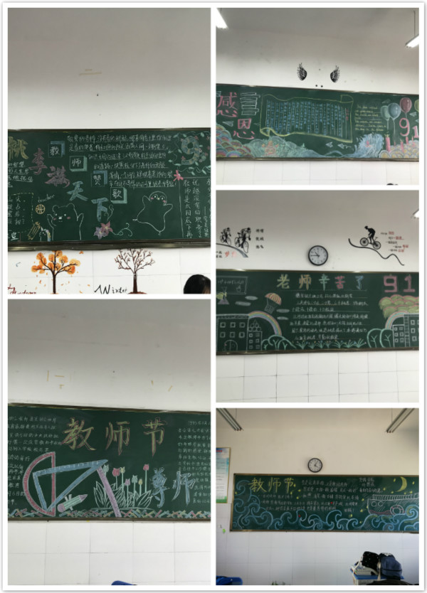 各班在教师节来临之际,开展了以“庆祝教师节”为主题的板报活动,以实际行动向老师们表达由衷的敬意。学生在查资料、办板报的过程中,了解老师的无私奉献。一支粉笔画出世界的五彩斑斓,两鬓斑白绘出爱的赞歌,三尺讲台育出多少栋梁!
