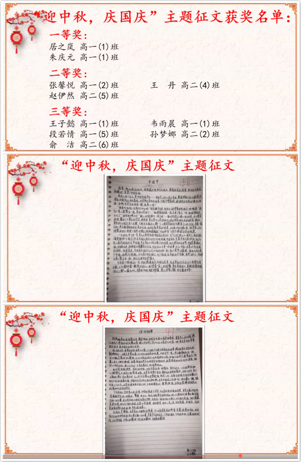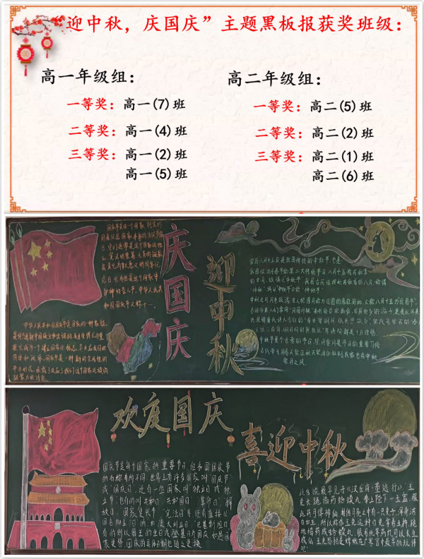 为庆双节,学校开展了以“团圆迎中秋·举国庆国庆”为主题的黑板报、手抄报、征文以及书法比赛一系列活动,通过活动培养学生的爱国情怀,审美情趣,提高学生的综合素质。学生们精心制作,献出了一张张精美的手抄报、一篇篇优秀的文章。手抄报版面设计活泼新颖、美观大方,文章词采飞扬,主题鲜明。这些都向我们展示了我校学生良好的精神风貌和爱国主义精神。