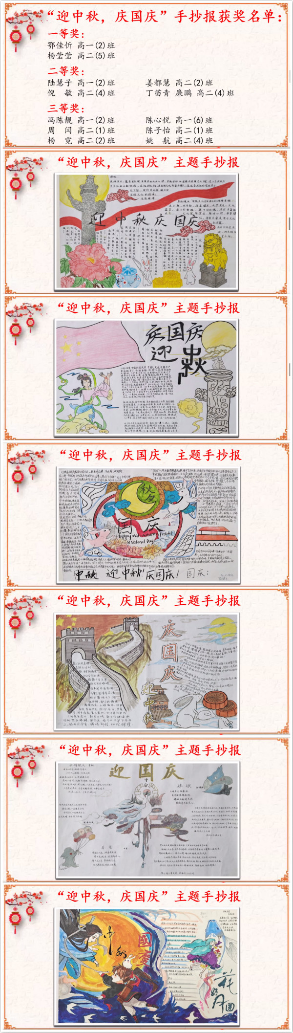 选送作品以表现内容,手抄报结合外观设计为评比的主要标准评比出一二三等奖。各班班主任为获奖同学颁发奖品和奖状。