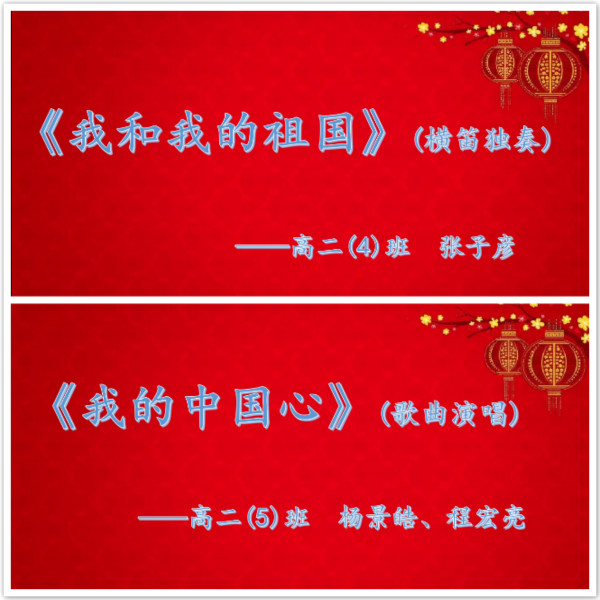 高二(5)班杨景浩和程宏亮同学演唱歌曲《我的中国心》,高二(4)班张子彦横笛演奏《我和我的祖国》。