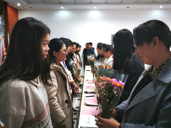 徒弟代表樊浩老师发言。樊老师表明了新时代青年一代的奋斗是常态的,也是幸福的,未来的教育教学之路还很漫长,但是他一定会坚定地走好每一步。