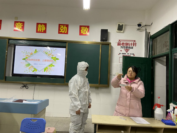 随后,在魏鑫主任的组织下,樊浩老师模拟了发热学生应急处理的整个流程。参会老师认真观看学习,并做好相关记录。