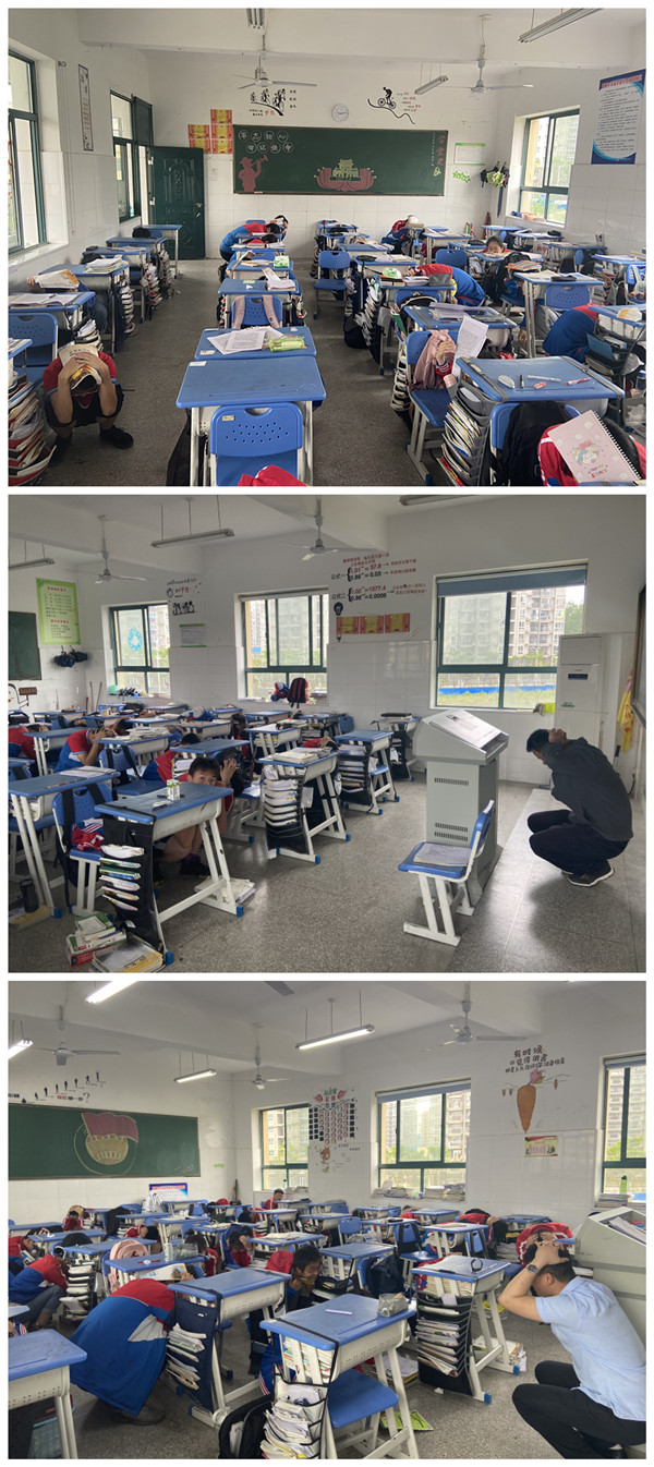 第一次警报响起,学校各楼梯口疏导负责人、班主任在第一时间各就各位,指挥学生就地避险,躲在桌子下或墙角处,十指紧扣,护住后脑。