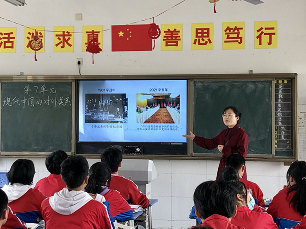 课中,杨婷老师以一组1901年晚清政府的外交图片与2021年现代中国的外交图片的对比进行导入,给同学们以强烈的视觉冲突,引起了同学们对本课的极大兴趣。本课内容围绕新中国初期的外交、20世纪70年代初开创外交新局面、改革开放以来的全方位外交展开,同学们积极踊跃发言并参与讨论。课程接近尾声,杨婷老师播放了一段中国外交天团的发言视频,看的同学们激情澎湃,燃起了爱国热情,达到了情感升华的效果。