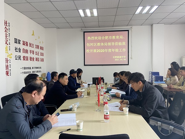 为加强民办学校管理,规范办学行为,提升办学水准。4月8日下午,合肥市教育局调研员李志平、财审处冯其宏、宣传处李东、包河区教体局社管办汤善龙、教育科刘飞等领导对我校开展2020年度工作年检。市教育局督导顾明书记、校董事长王俊等行政班子成员全程参与。