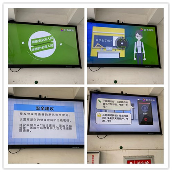 学校充分利用LED电子屏辅助宣传。每天滚动播放本次网络安全周主题“网络安全为人民,网络安全靠人民”及相关宣传标语,最大范围向教师和学生宣传网络安全周活动。