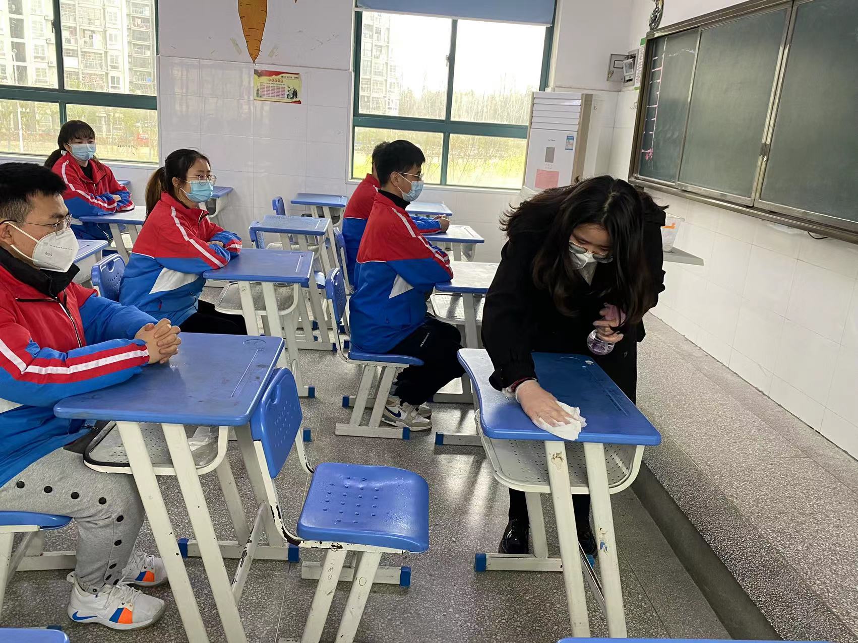 与此同时,班主任王老师示范更换 N95 口罩程序,并组织全班学生依次更换N95口罩,对学生桌面进行规范消杀。