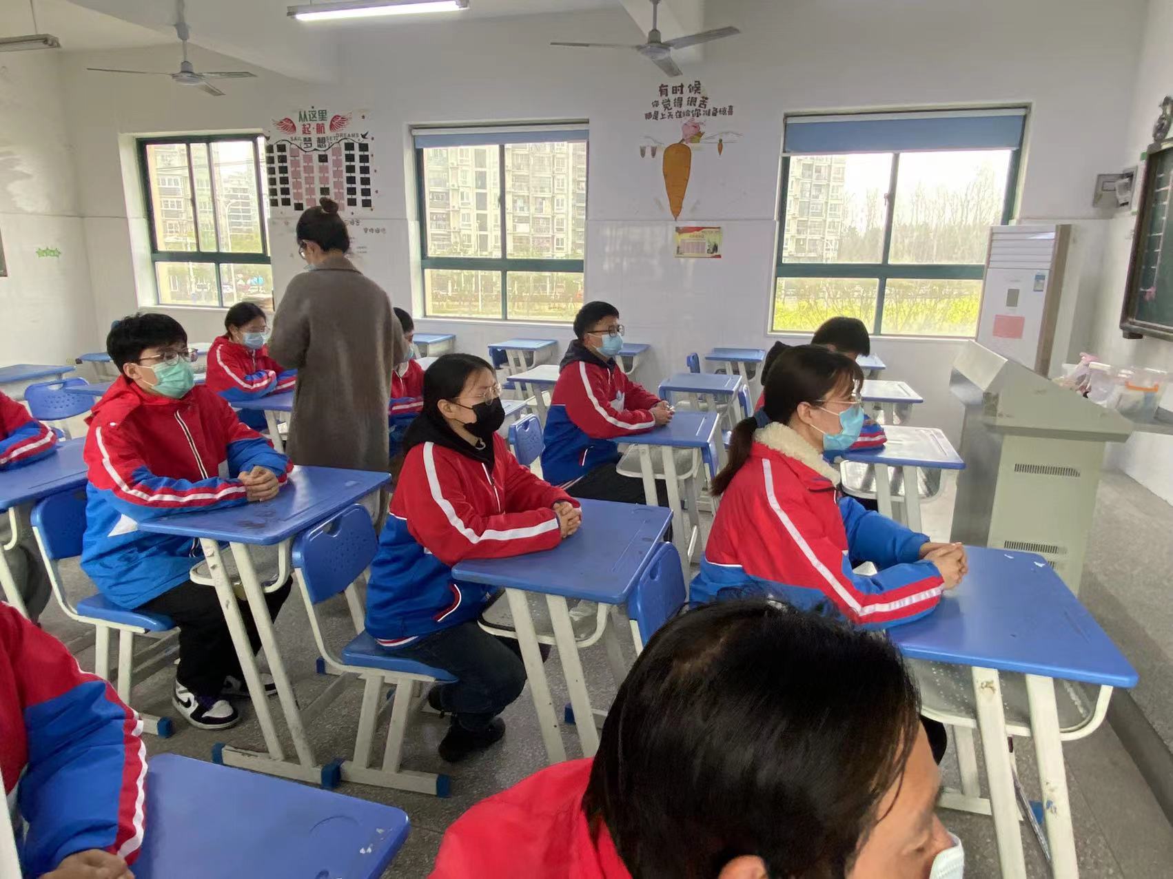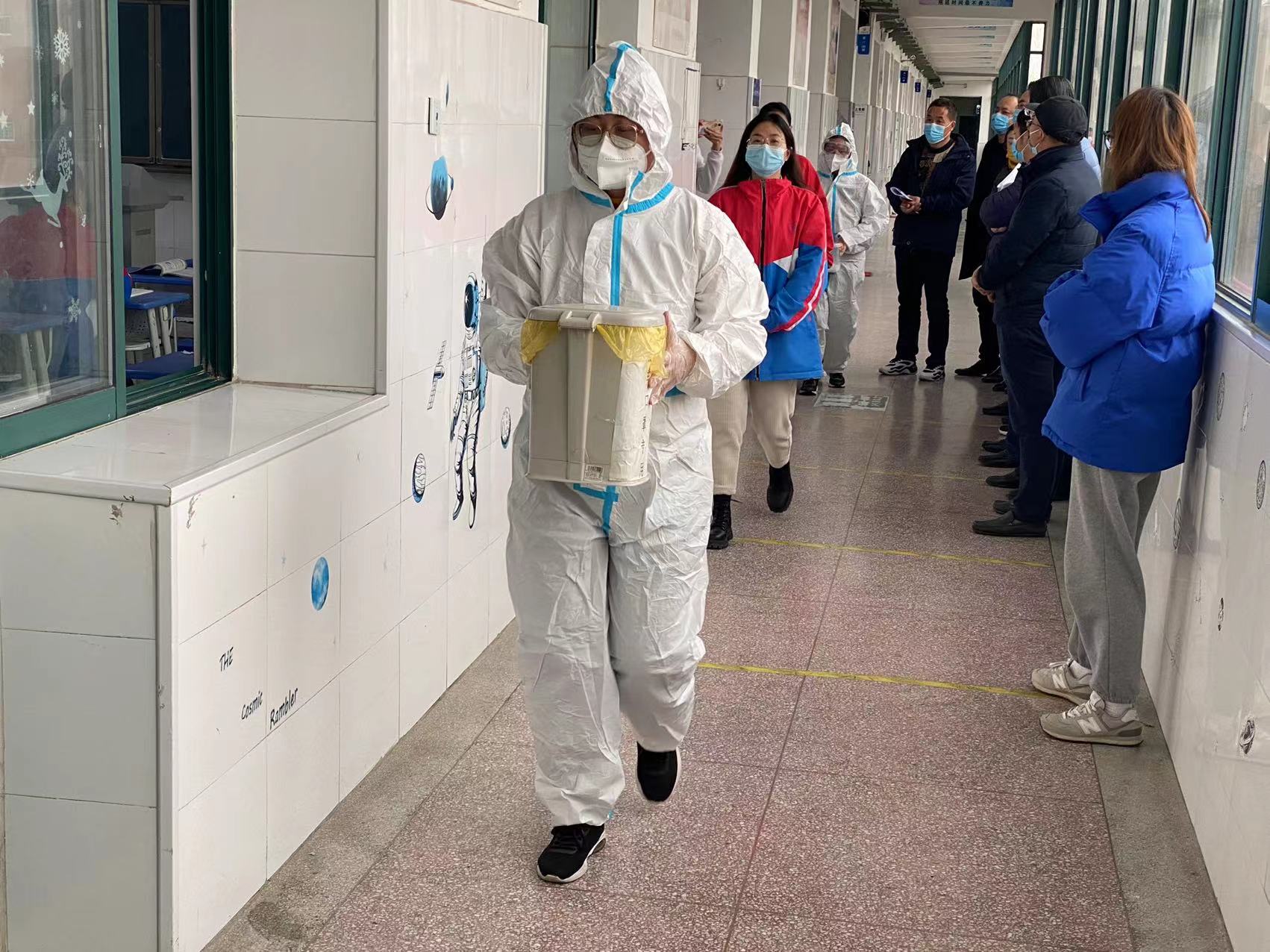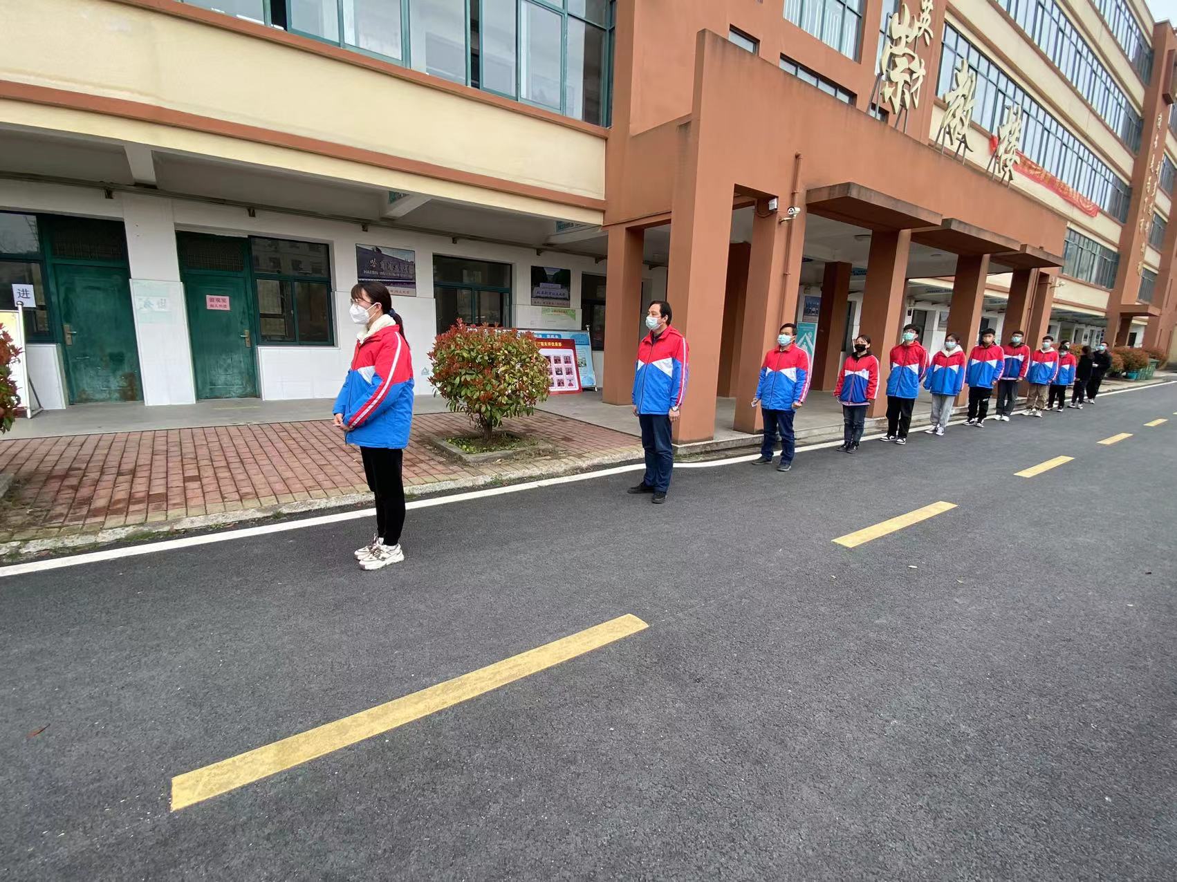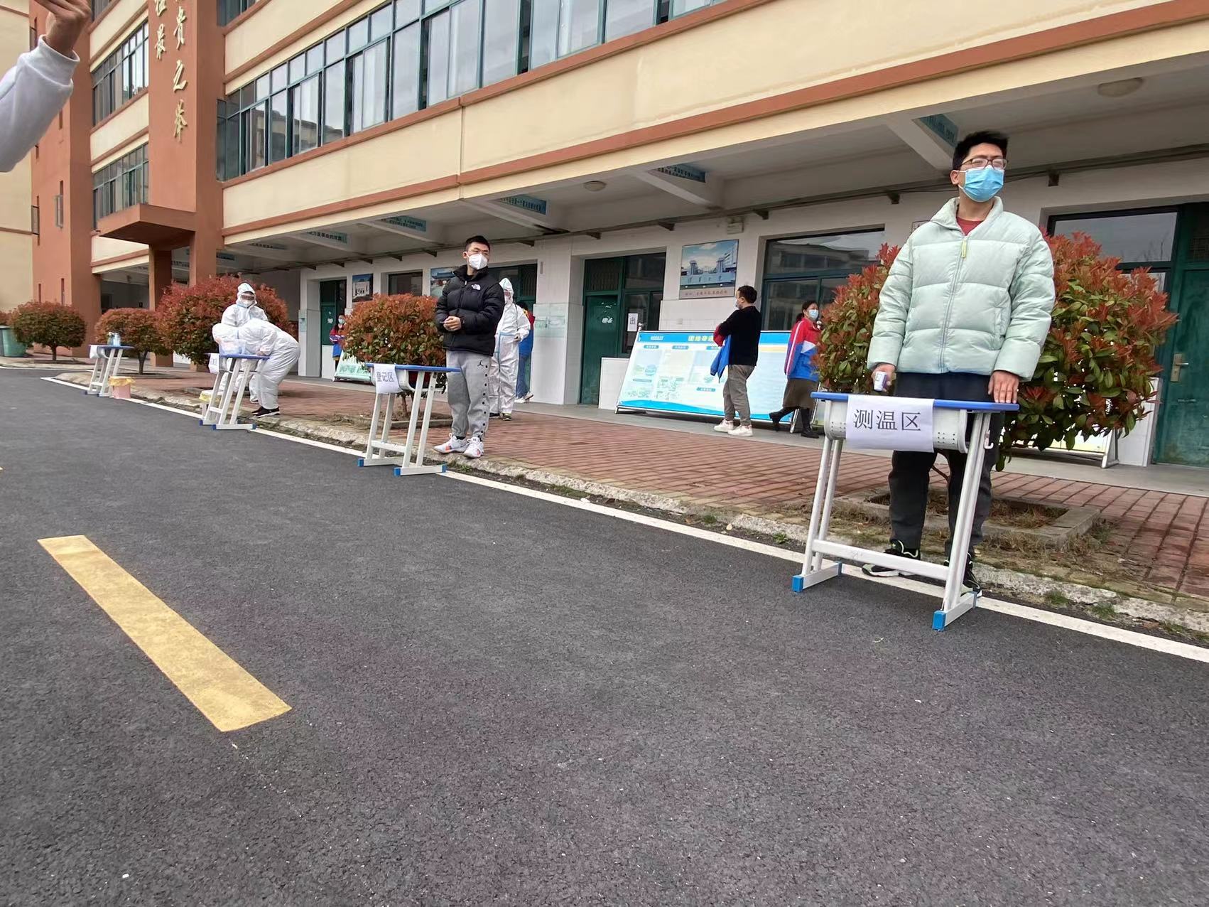 各班班主任给学生分发检测二维码,组织学生更换N95口罩、间隔一米有序前往核酸检测点。