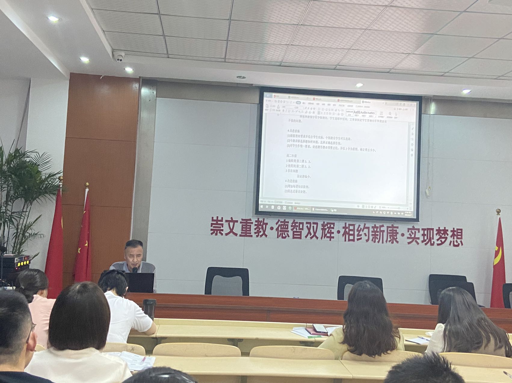 组内研讨上,英语教研组长徐蕾老师、物理备课组长董朝民老师、历史备课组长汪颖老师以及生物备课组长徐影老师都分享了组内教师备课的照片及教案实录,教师备课认真,笔记详实,双色笔备注、二次备课痕迹明显。