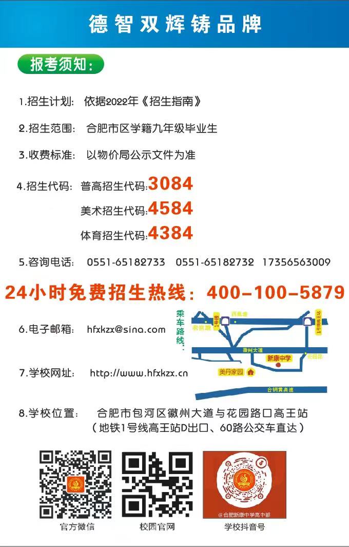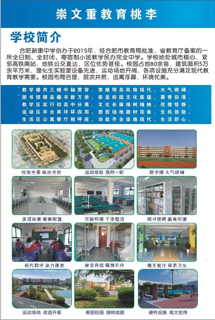 合肥新康中学创办于2015年,经合肥市教育局批准,省教育厅备案的一所全日制、全封闭、寄宿制民办完全中学。学校地处城市核心,紧邻高铁南站,地铁公交直达,区位优势甚佳。