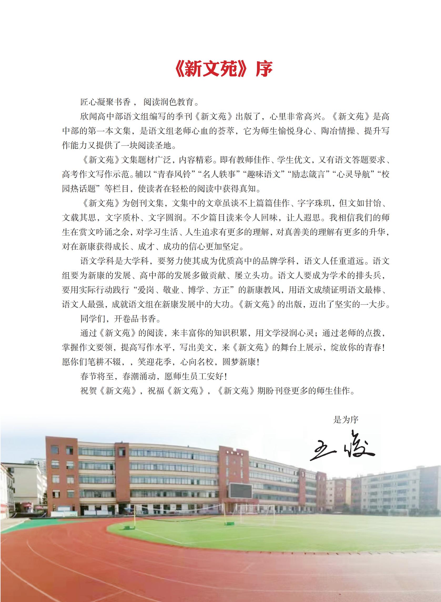 合肥新康中学高中部校本刊物《新文苑》第一期于2023年元月出版了。《新文苑》是高中部的第一本文集,是语文组老师心血的荟萃,它为师生愉悦身心、陶冶情操、提升写作能力又提供了一块阅读圣地。