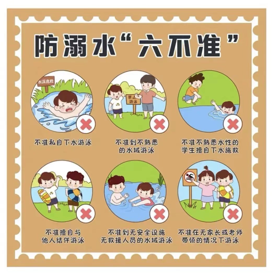 1、加强防溺水教育。天气渐热,假期时长,希望广大家长增强安全意识,切实承担监护责任,加强预防溺水提醒,教育孩子重点要做到“六不”:不私自下水游泳;不擅自与他人结伴游泳;不在无家长或教师带领的情况下游泳;不到无安全设施、无救援人员的水域游泳;不到不熟悉的水域游泳;不熟悉水性的学生不擅自下水施救。尤其要教育孩子,遇到同伴溺水时避免盲目施救,要立即寻求成人帮助。广大家长务必要克服麻痹思想和侥幸心理,切实增强孩子防溺水的安全意识。