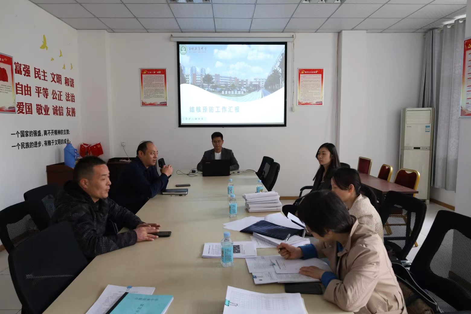 督查组一行首先听取了我校高中部段方校长关于传染病防控的工作汇报,段校长从六个方面做了细致的汇报。检查组逐一审查了我校肺结核防控工作台账,对我校防控工作给予了充分的肯定,并指出要进一步提高师生群体对传结核病防治的认知水平,加强自我保健意识,增强预防观念,营造全校共同防范的良好氛围。