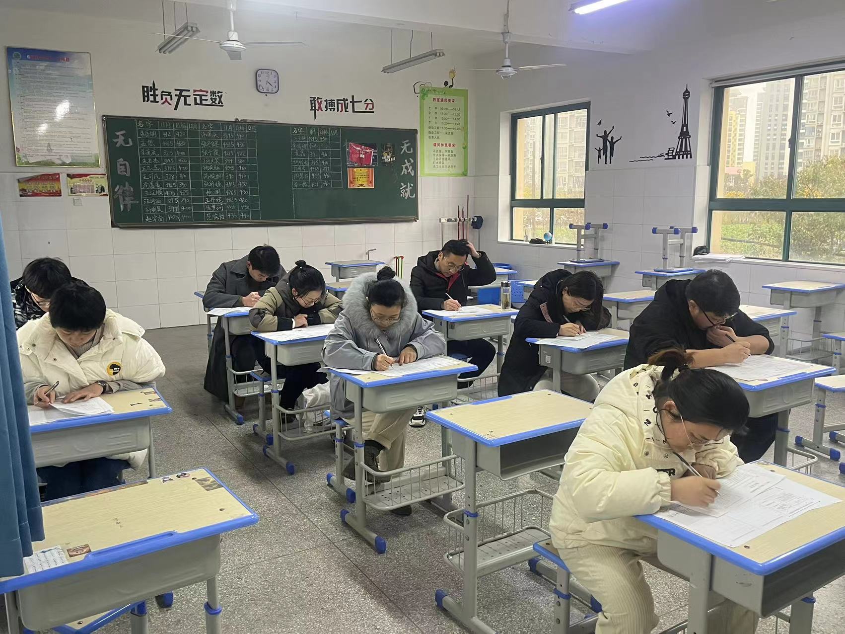 为提高教师的专业知识,促进教师的专业成长,优化教师的课堂教学。我校特举行师生同测,专备教师考场,与学生同时间同试卷参加考试,或许我们不能人人都成为优胜者,但我们应该做一名追求进步、超越自我的勇敢者。