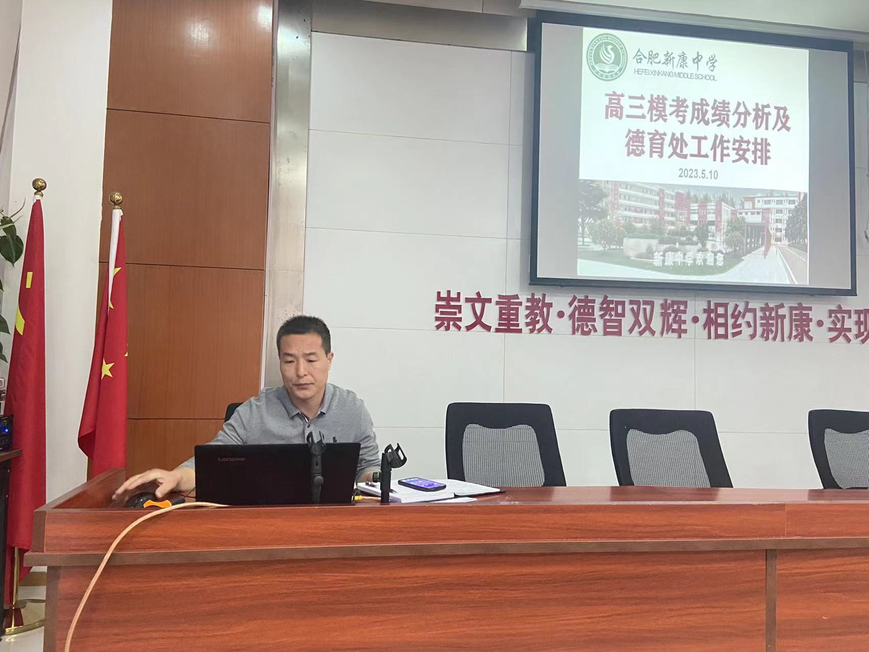 李超群主任对近期高三的全市二模和江淮十校联考成绩做了具体的分析,向全体老师做了分析报告。同时对5月份德育处工作做了详细的安排。他指出在高三接下来的20多天里老师要认真备课,提高课堂效率,关注弱科生、临界生,认真落实培优补差,弱科补短,心理帮扶等措施。各备课组要认真准备最后一卷,要集体打磨,关注常考点、易错点、易混点,研究情境题、续写题、多选题答题方法。帮助学生查缺补漏,因材施教,因人指导。