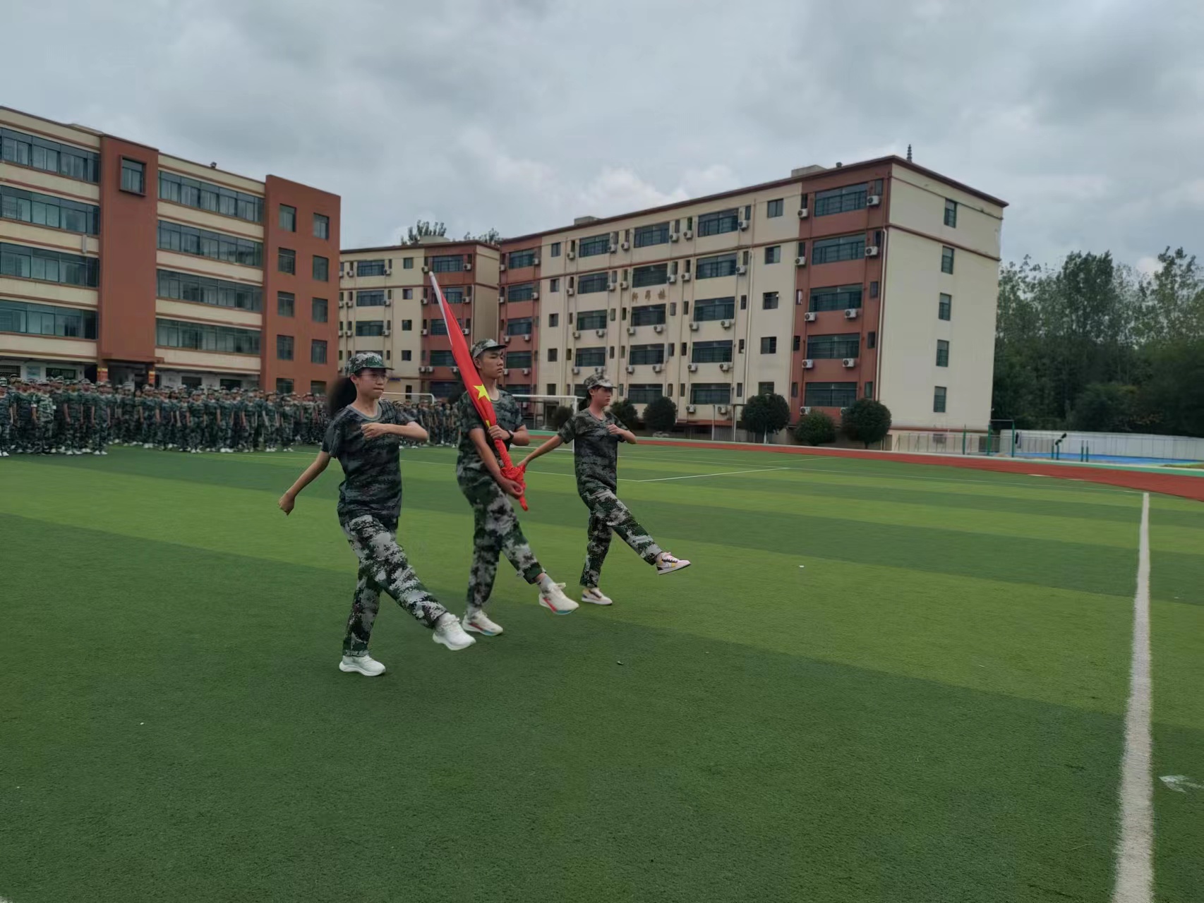伴随着雄壮的国歌声,鲜艳的五星红旗冉冉升起,军训汇报表演正式拉开序幕。