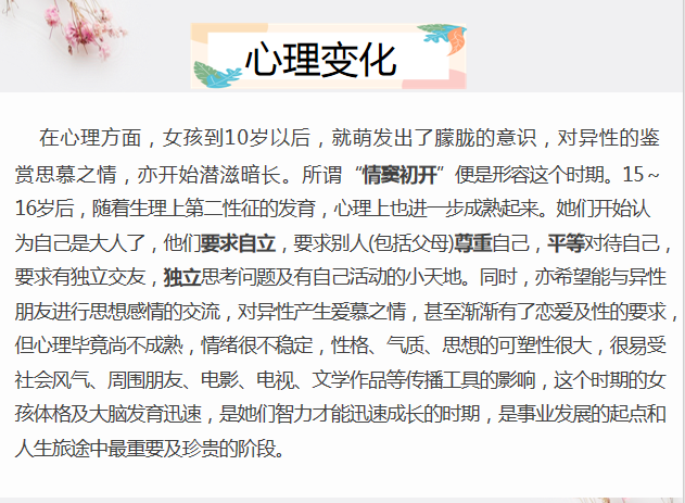 近年来,我校高中部定期组织开展女生主题讲座,科普生理心理相关知识,帮助女生更好地适应生理和心理变化,从而促进他们的学习,收到了广大女同学的欢迎。今后,我们将持续做好这项工作,守护健康,相伴成长。