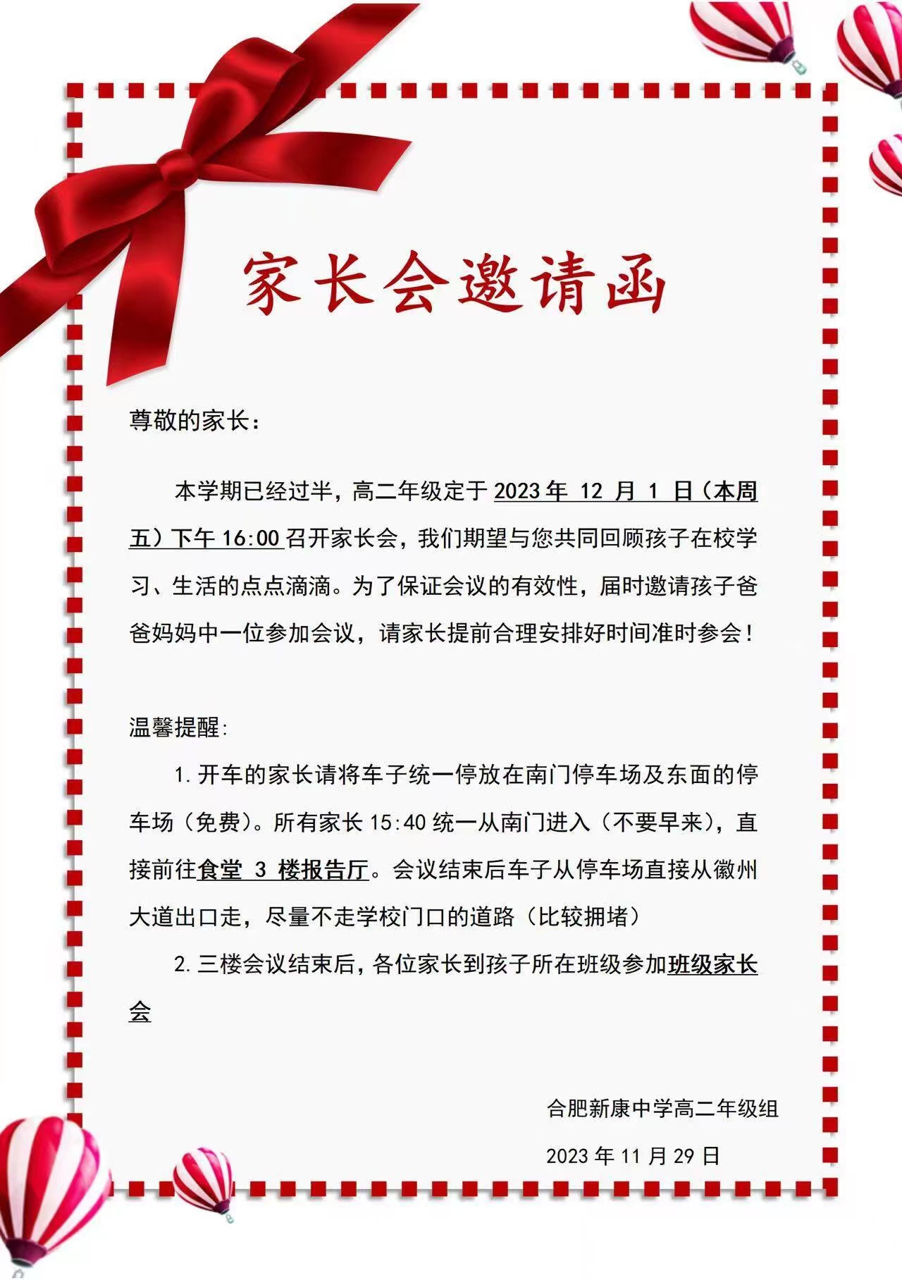 为提升家校共育实效,发挥教育合力,合肥新康中学高二年级于12月1日下午举行家长会,家长和老师们齐聚一堂,共同探讨和交流学生的成长和教育问题。前期,年级部精心布置规划,制作并发布精美的家长会邀请函,提前进行卫生大扫除,布置会议会场,营造良好的会场环境。
