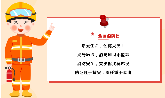 今天是11月9日,也是第32个全国消防日。11月是消防宣传月,今年的主题是“预防为主,生命至上”。消防安全是幸福生活的保障,消防安全工作是一项知识渊博、科学性强、社会性强的工作,涉及各行各业、千家万户,关系到经济发展、社会稳定和人民安居乐业。只有在全社会普及消防法律法规和消防科学技术知识,提高全体人民的消防意识,提高全体人民预防和扑救火灾的能力,才能有效地预防和减少火灾的危害。