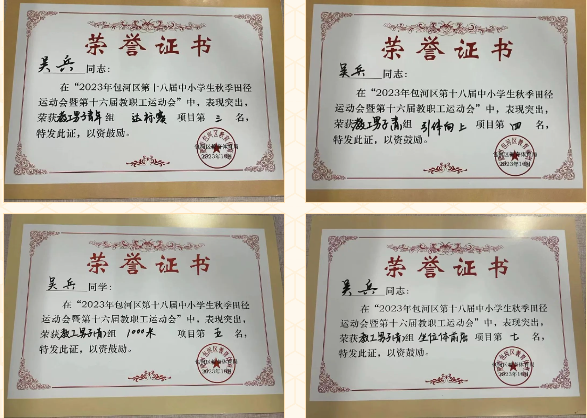 吴兵:十字象限跳第五名、引体向上第四名、1000米第五名、坐位体前屈第七名、单脚闭眼站立第二名、立定跳远第二名、达标赛第三名。