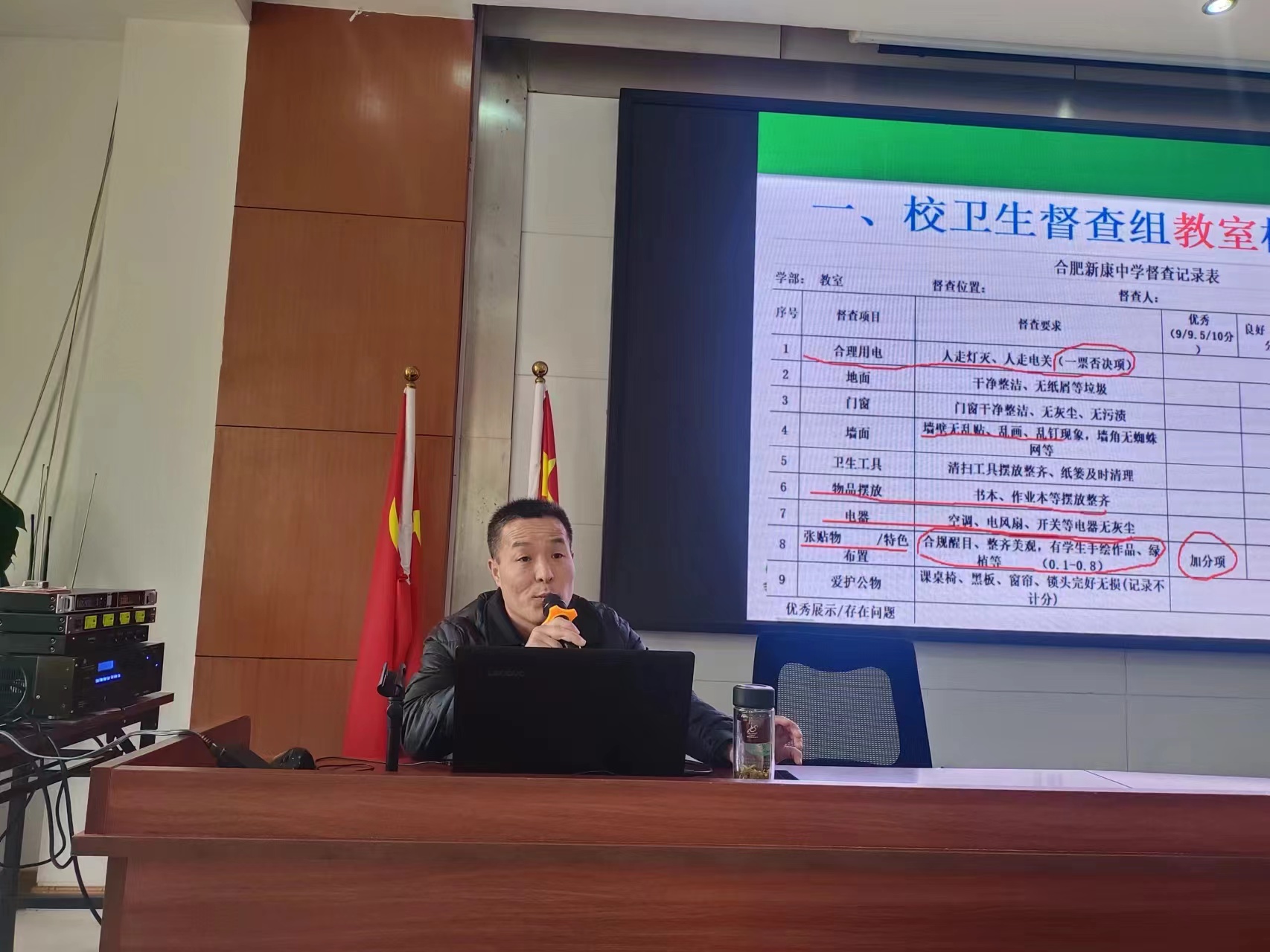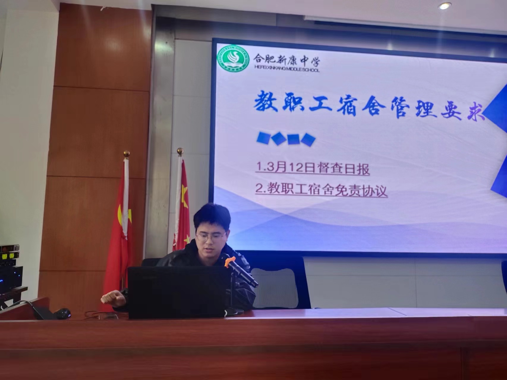 学校高度重视安全工作,开学以来,对于校园安全常抓不懈,校园督查工作有条不紊地进行,高中部办公室江正主任宣读学校教职工宿舍管理制度,明确要求,逐条解读,以确保每位教职工都能在一个安全、舒适的环境中生活和工作。江主任要求每位教职工都要遵守相关规定,共同维护宿舍的良好环境。禁止任何形式的违规电器使用、私拉乱接电线等行为。