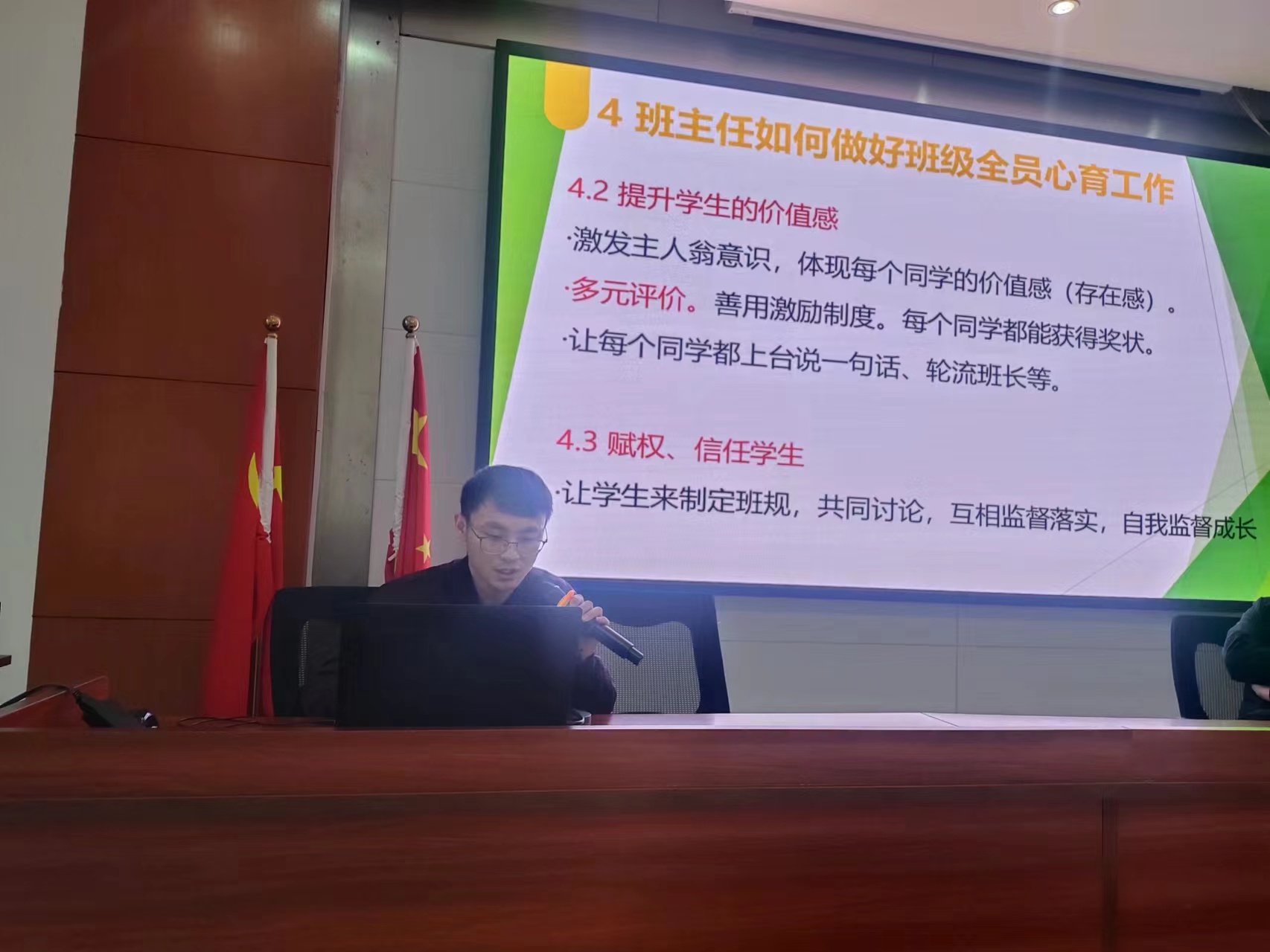 学校心理咨询室盛爽老师指导各班班主任如何做好班级学生的心理健康教育工作,他强调了班级心理健康教育工作是维护学生身心健康、促进学生全面发展的重要一环。作为班主任,首先要树立正确的心理健康教育观念,关注学生的内心世界,尊重学生的个性差异,积极营造健康、和谐、积极向上的班级氛围。