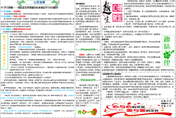 开学之初,在学校高中部校长胡文波提议倡导下,成立了心理报纸编辑部,心理教师柴媛负责版面构思、文字编辑,信息技术教师汪治理负责版面设计。为了报纸更贴合实际,柴老师对学生常见的心理困扰展开了调研,在调研的基础上再进行框架的构思。经过两周的细心筹划,心语报大体内容板块落定,分为七大板块,:“心灵故事”、“个体咨询”、“心理测试”、“心理百科”、“心理咨询科普”、“开心一刻”、“心语信箱”,内容丰富,且兼顾专业性和趣味性。