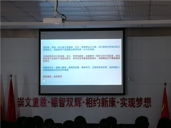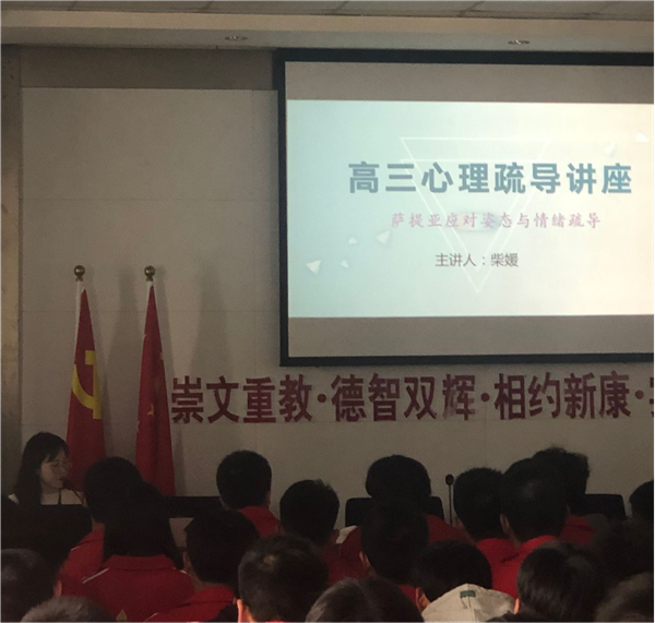 2019年10月21日下午,合肥新康中学组织全体高三学生,举办了一场以“萨提亚应对方式与情绪疏导”为主题的心理专题讲座。此次讲座由高中部德育处副主任余丽统筹策划,心理老师柴媛负责前期海报制作和现场主讲,为高三学生呈现了一场映照自我、触及灵魂的讲座。
