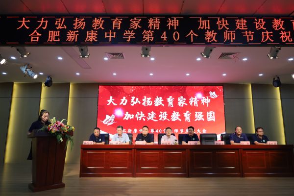 出席本次庆祝大会的领导有:合肥市教育局派驻督导专员、第一书记稂乐民,合肥新康中学党支部书记、校长王俊,安徽新康教育投资集团董事会代表王海董事,特聘教学顾问顾明,党支部专职副书记陈晓永,高中部校长段方,初中部校长徐学法,初中部副校长龚红卫。本次大会由校长助理郭静主持。