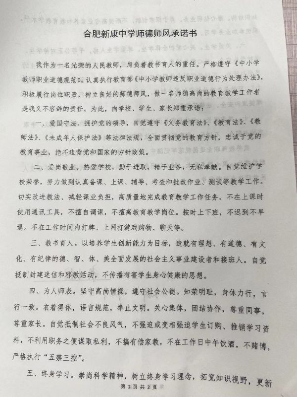 “师者,以德为先”,高尚的师德师风是教师从事教育工作的灵魂。近日,合肥新康中学积极响应教育部门关于加强师德师风建设的号召,举办了以“清清白白为师”为主题的五个一主题教育活动。此次活动旨在全面提升教师的职业道德素养,弘扬清正廉洁的教风,为学生树立良好的榜样。