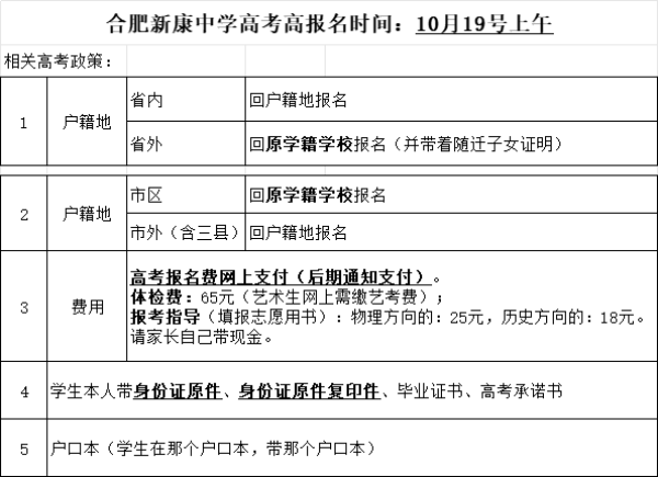 根据合肥市考试院2024年高考工作会议精神并结合我校实际情况,现将我校历届生(复读生)高考报名工作安排如下: