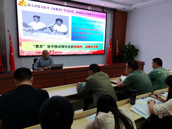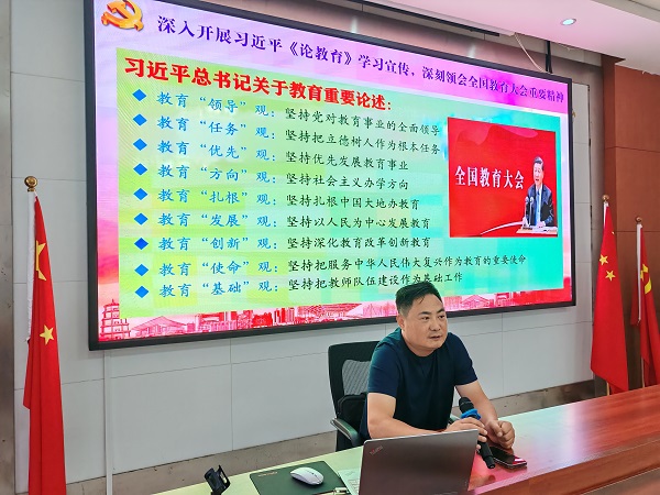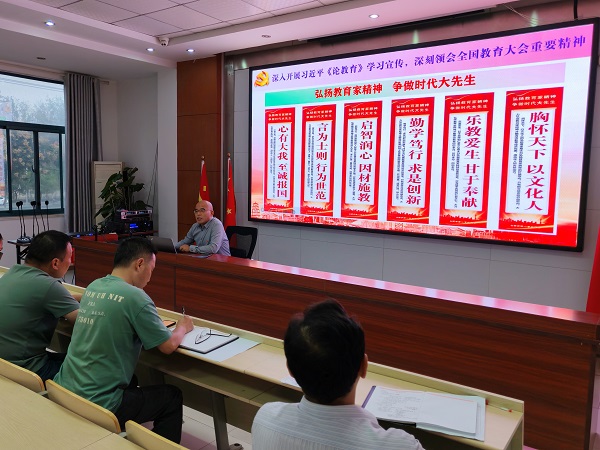 专职副书记陈晓永在动员大会上带领全体教职工深入学习领会习近平同志《论教育》的精神实质和实践要求,明确新时代教育的使命与担当。校党支部将通过书记专题党课、党员集中研讨、学习心得评比等,引导全体老师不断提升自身教育情怀与专业素养。
