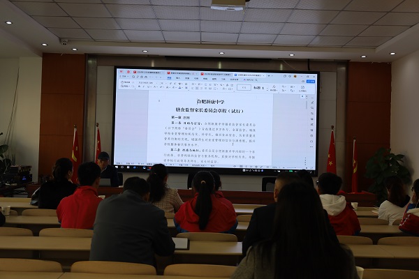其次,膳委会成员集中学习、讨论《合肥新康中学膳食监督家长委员会成立方案》《合肥新康中学膳食监督家长委员会章程》《合肥新康中学膳食监督家长委员会岗位职责》三个试行文件,在制度建设上确保学校食堂管理的规范化、科学化,推动校园食品安全、伙食质量及营养均衡的实现,增强师生对食堂管理的信任。